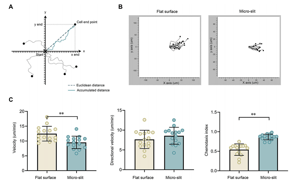 图4.中性粒细胞在平面和微缝中的运动比较。