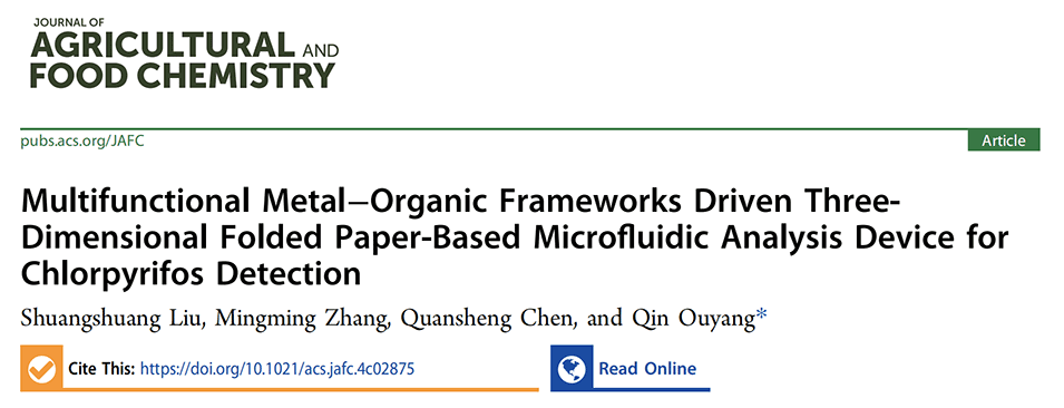 食品中的毒死蜱(CPF)残留对生态系统和人类健康构成严重威胁。近期,江苏大学食品与生物工程学院欧阳琴教授团队提出了一种基于多功能金属有机框架的三维折叠纸基微流控分析装置(3D-μPAD),可通过荧光-比色双模式读出实现对毒死蜱的快速定量检测。相关研究以“Multifunctional Metal–Organic Frameworks Driven Three-Dimensional Folded Paper-Based Microfluidic Analysis Device for Chlorpyrifos Detection”为题目,发表在期刊《Journal of Agricultural and Food Chemistry》上。