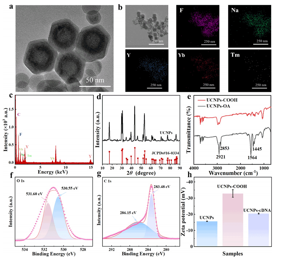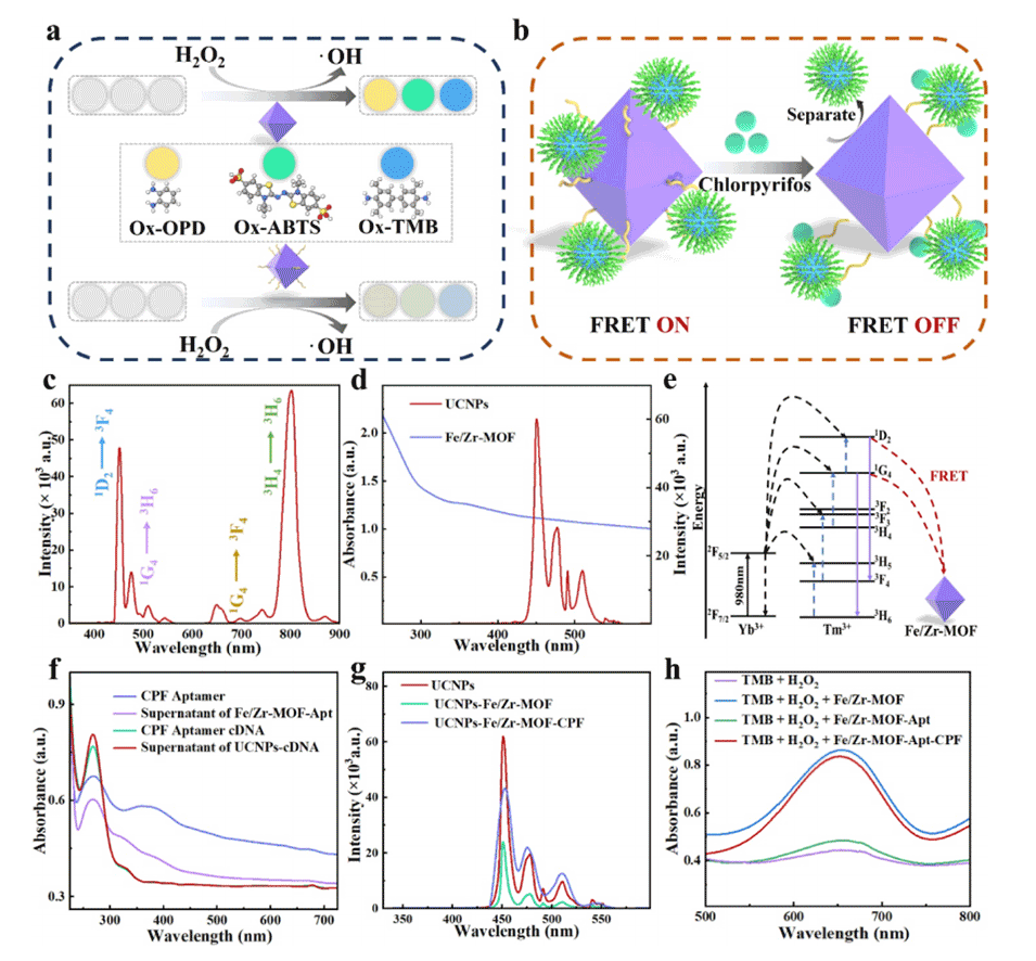 2、荧光共振能量转移(FRET):通过CPF适配体和cDNA的结合,使得UCNP(上转换纳米粒子)与Fe/Zr-MOF之间的距离缩短,触发FRET效应,导致UCNP的荧光强度变化,从而实现对CPF的定量检测。
