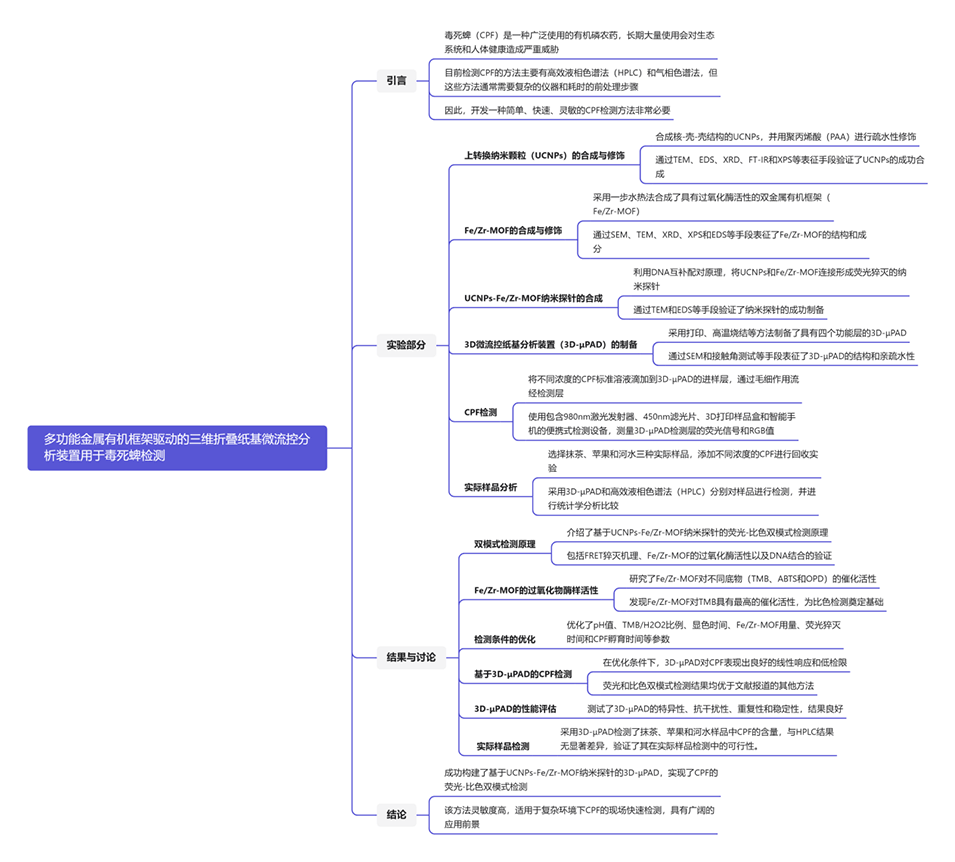 1、本研究提出了一种基于多功能金属有机框架的三维折叠纸基微流控分析装置(3D-μPAD),可通过荧光-比色双模式读出实现对毒死蜱(CPF)的快速定量检测。