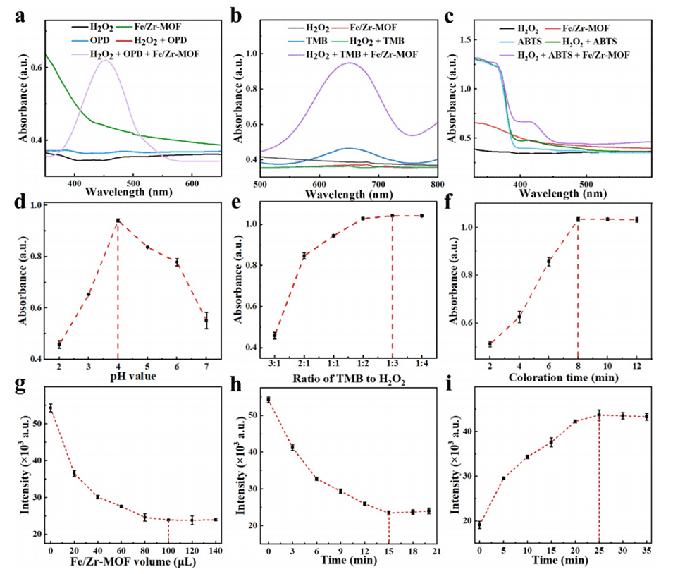 图5.Fe/Zr-MOF的过氧化物酶样活性和CPF检测参数的优化
