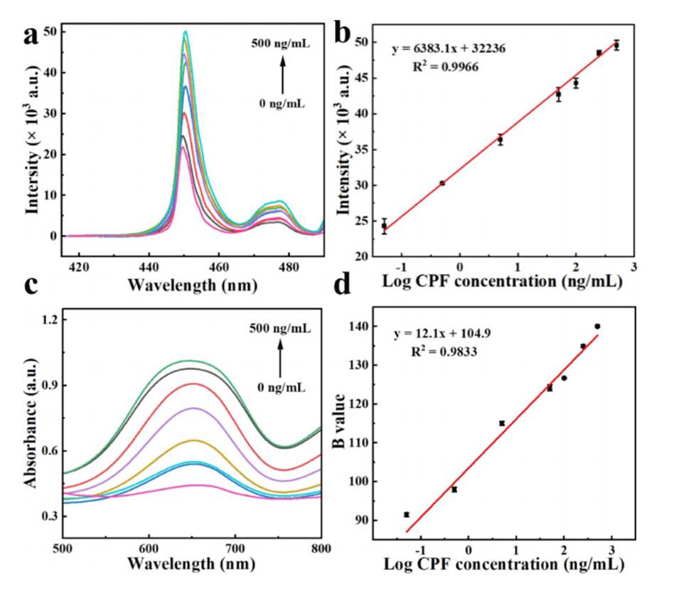3、当存在CPF时,检测区域的荧光强度逐渐恢复,颜色从无色变为蓝色,与CPF浓度呈良好线性关系,检测限分别为0.028(荧光)和0.043(比色)ng/mL。