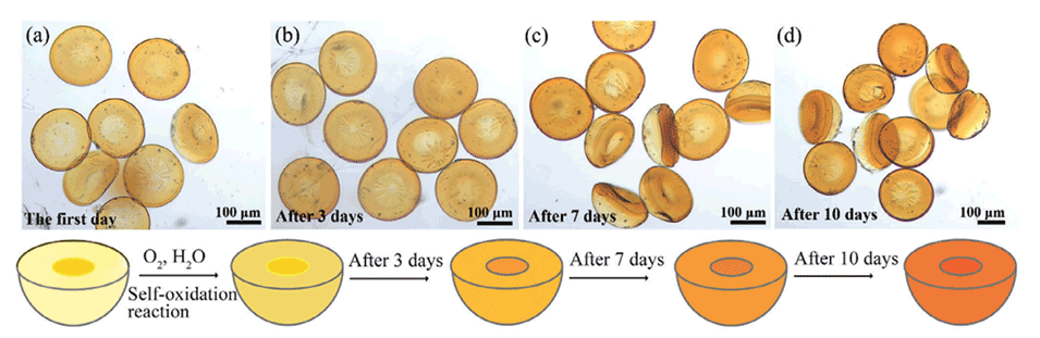 图5.a-d)不同时间(1、3、7和10天)的海藻酸铁微凝胶自氧化反应过程中颜色变化的光学显微镜图像。下图是微凝胶在自氧化过程中颜色变化的放大图。