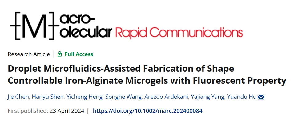 近期,北京交通大学胡远渡课题组提出了一种制造海藻酸铁微凝胶的简便方法,使用单乳液液滴作为模板,并通过芯片外交联技术来固化滴液。相关研究以“Droplet Microfluidics-Assisted Fabrication of Shape Controllable Iron-Alginate Microgels with Fluorescent Property”为题目,发表在期刊《Macromolecular Rapid Communications》上。