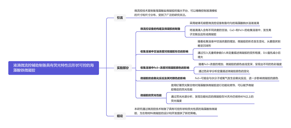 1、本研究采用微流控技术制备了具有可控形状和荧光特性的海藻酸铁微凝胶,其有望用于药物输送载体和仿生结构。