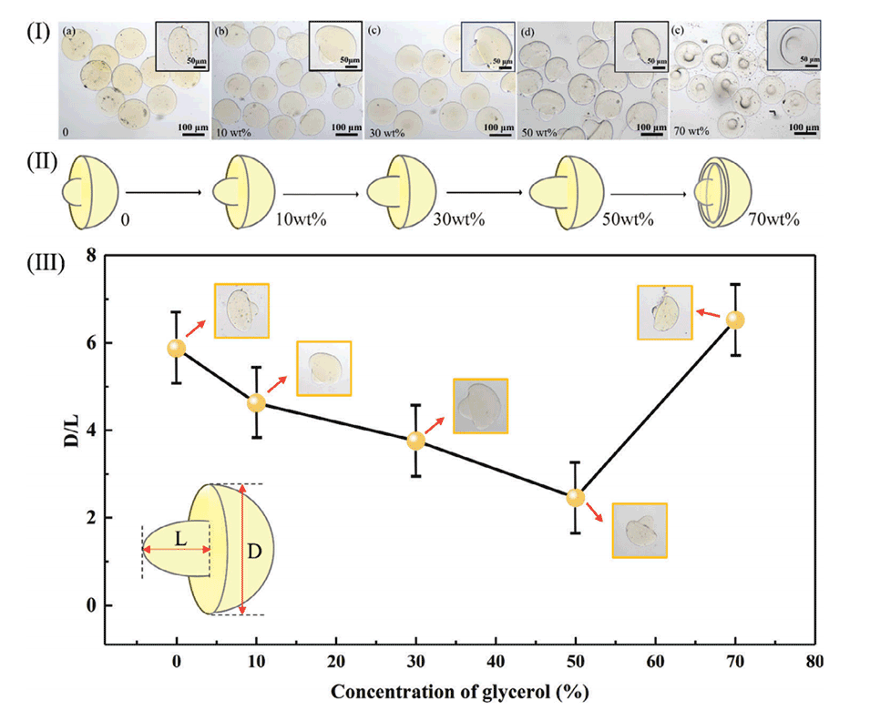 图2.(I):a-e)微流体装置产生的初始球形液滴形成的微凝胶的光学显微镜图像。液滴由1.5wt%SA组成,并收集在含有8wt%CaCl2、2wt%FeCl3和不同甘油浓度(0、10、20、30、50和70wt%)的不同溶液中。插图显示了相应放大微凝胶的侧面形态。(II):相应微凝胶的形态示意图。(III):在具有固定Fe3+和Ca2+浓度但具有不同甘油浓度的收集溶液中获得的海藻酸铁微凝胶的变形程度的示意图。该图显示了凝胶浴中微凝胶的D/L值与甘油浓度之间的关系。插图是所选点的代表性光学显微镜图像。误差条表示标准偏差。
