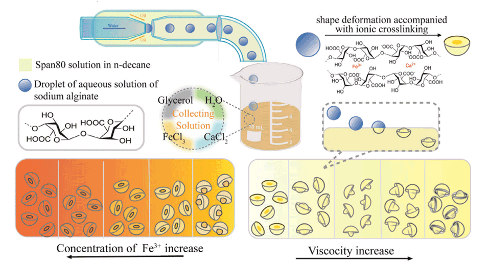 6、液滴变形和离子交联相结合,形成了形态各异的海藻酸铁微凝胶。