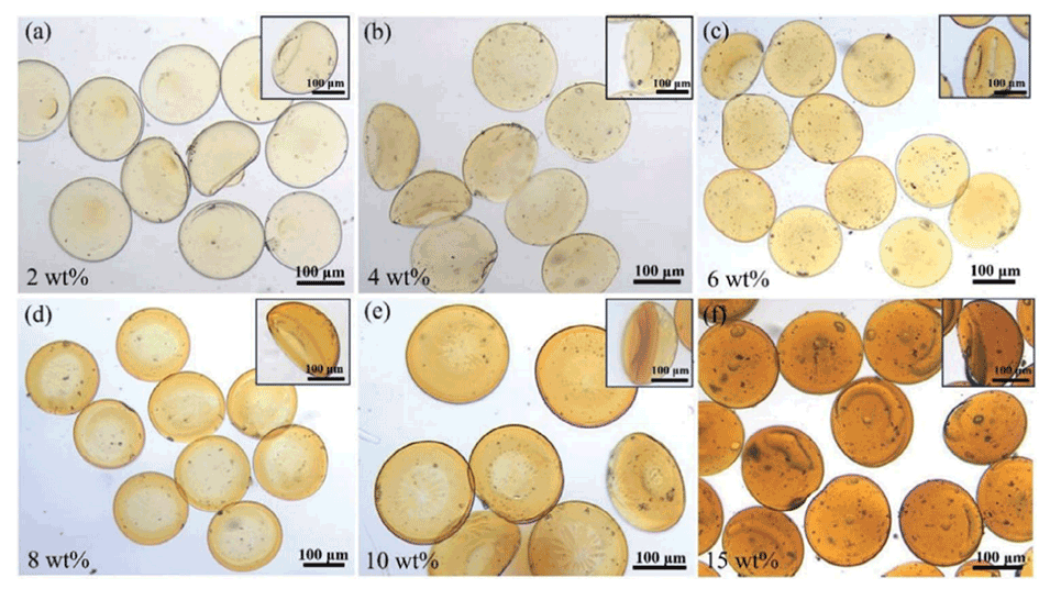 图3.a-f)在含有不同Fe3+浓度(2、4、6、8、10、15wt%)的收集溶液中获得的微凝胶的光学显微镜图像。在所有情况下,收集溶液中的甘油浓度都保持在30wt%,而所有原始液滴都由1.5wt%SA组成。插图显示了相应微凝胶的侧面形态。