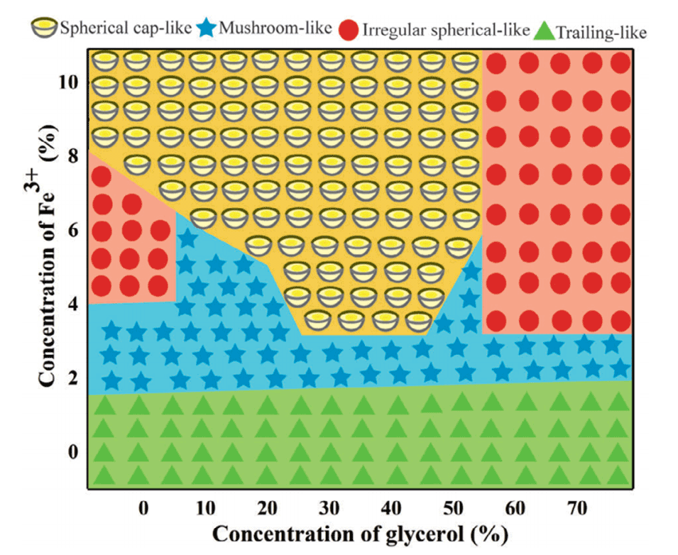 图4.在具有不同浓度溶质的收集溶液中获得的海藻酸盐微凝胶的相图,其中甘油浓度在0至70wt%范围内,Fe3+浓度在0到10wt%范围内。所有的微凝胶都是由1.5wt%SA的水溶液液滴形成的。收集高度都保持在15mm。