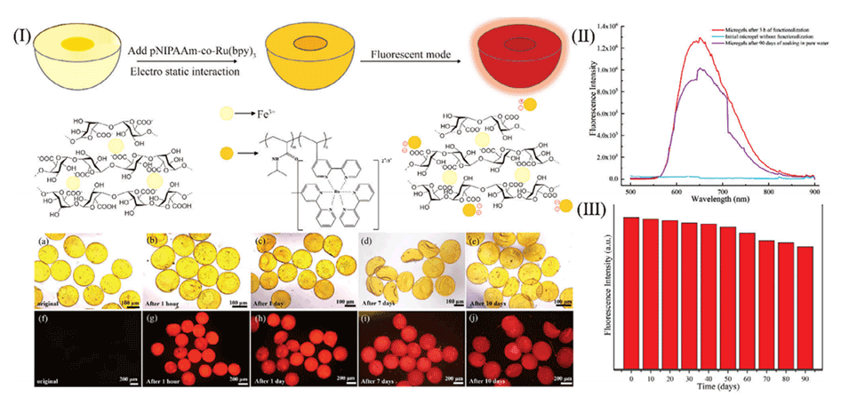 图6.(I)在6wt% Fe3+收集溶液中获得,并在钌聚合物溶液中进一步功能化的微凝胶的透射模式光学和荧光显微镜图像。a)用钌聚合物功能化之前的光学和f)荧光显微镜图像;b)微凝胶在钌聚合物溶液中浸泡1小时后的透射和g)荧光显微镜图像;c-e)钌聚合物修饰的微凝胶在纯水中浸泡1、7和10天的光学和h-j)荧光显微镜图像。(II)最初未功能化的微凝胶、功能化3小时后的微凝胶和在蒸馏水中浸泡90天后的功能化微凝胶的荧光光谱。(III)条形图描绘了在0.5wt%的钌基线性聚合物水溶液中功能化3小时,然后在纯水中浸泡0-90天后,海藻酸铁微凝胶荧光强度的变化。