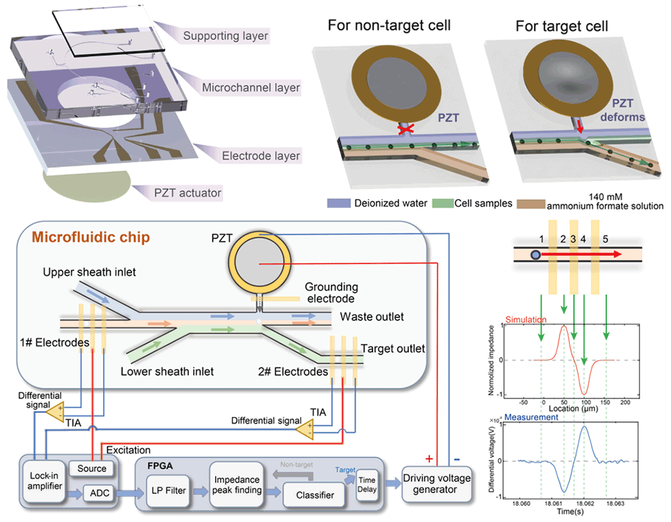 本工作中搭建了具有四层结构的微流控芯片,如图1所示。利用IFC进行细胞的电学及尺寸特性表征实现不同细胞的识别,待其流经分选区域时由压电执行单元对目标细胞进行分选,通过合适的流速配比,执行单元将目标细胞推至作为下鞘液的质谱兼容的挥发性盐溶液中,同时实现样本的分选与除盐。芯片采用两套电极,其中第1套用于单细胞电学表征,第2套用于表征确认除盐效率。