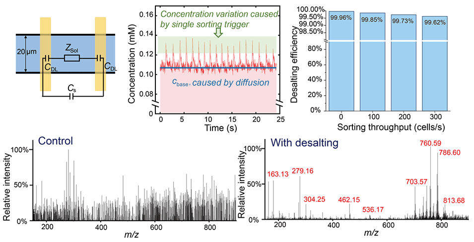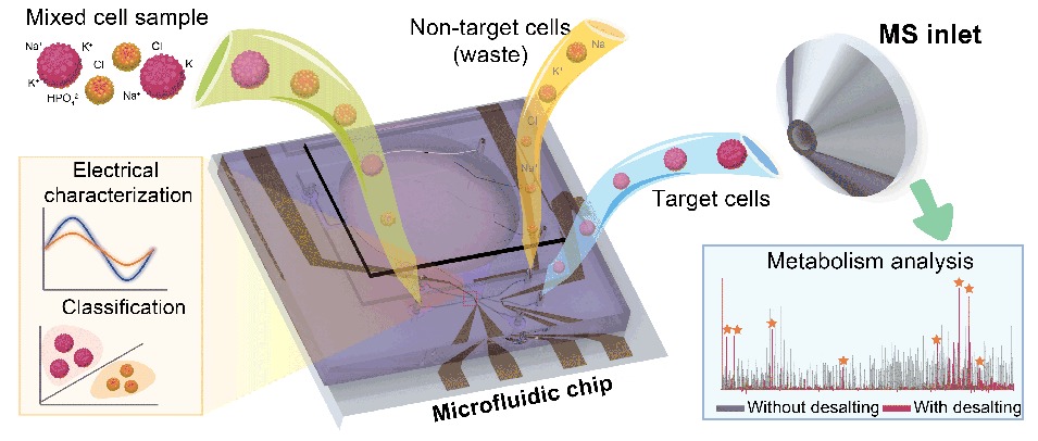 单细胞质谱检测技术为单细胞化学特性分析提供了一种强有力的免标记分析手段,并在癌症分析、药物刺激、免疫分析等临床应用中展现出潜在价值。然而单细胞质谱往往需要进行必要的预处理操作,如将目标细胞从混合细胞群体样本中分离出来以提高质谱检测的准确性;除盐操作去除细胞常见缓冲液中的非挥发性盐,降低基质效应提高质谱检测灵敏度。目前这些预处理往往是通过多种设备或手动操作完成,效率较低;开发有效的一步式预处理方法对于单细胞质谱分析意义重大,但目前这方面的研究较为缺乏。