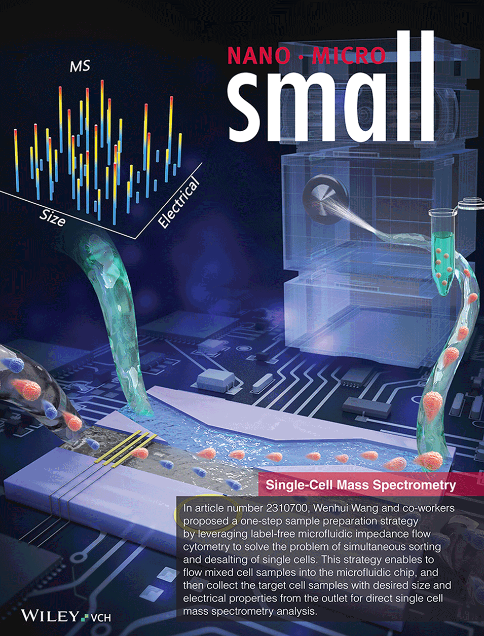 为此,清华大学的王文会教授团队提出一种基于阻抗流式细胞术IFC的“一步式”分选除盐质谱预处理系统,经过处理的细胞样本可直接兼容现有的免标记质谱流式、液滴微萃取等单细胞质谱分析手段。研究工作以“Microfluidic Impedance Cytometry Enabled One-Step Sample Preparation for Efficient Single Cell Mass Spectrometry”为题发表在期刊Small上,并被选为Frontispiece。