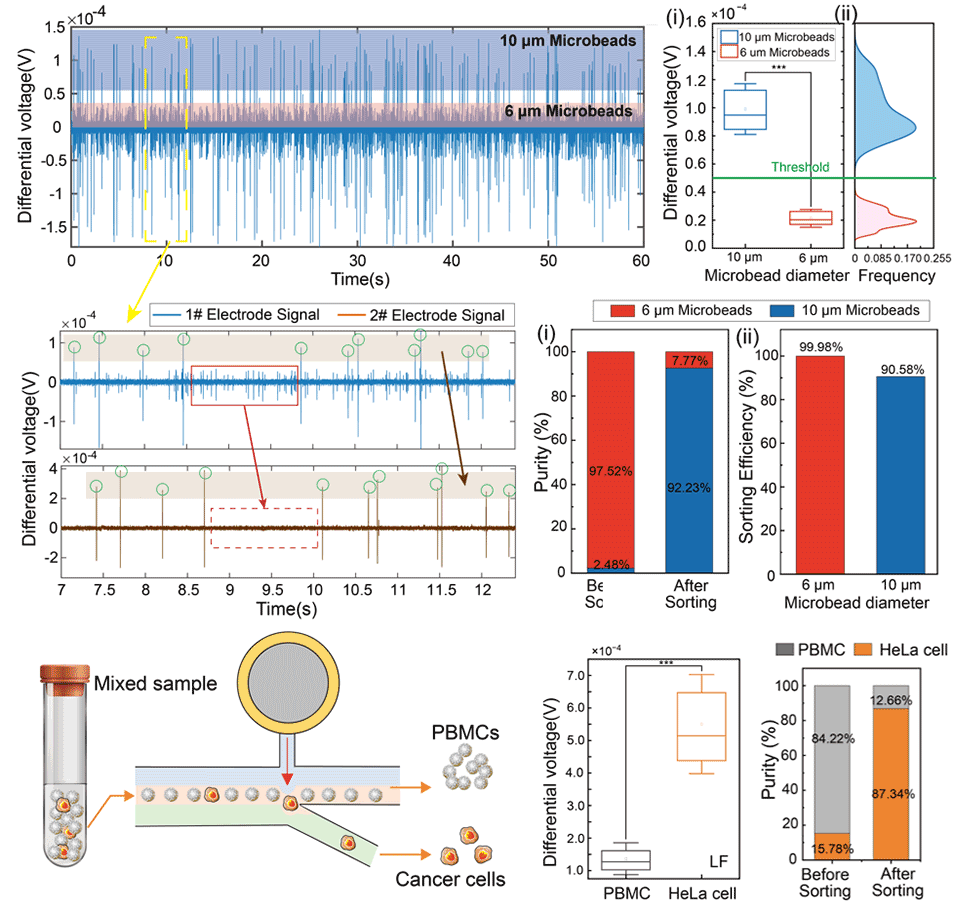 以商用均一性较好的6 μm和10 μm直径的PS微球对系统的分选效率进行了表征。在约9000个样本的实验中,系统展现出了99.53%的分选成功率,同时样本中的10 μm微球纯度由2.48%提升至92.23%,实现了约37倍的富集效率,如图3所示。此外在模拟血液中CTCs分离的实验中,在HeLa癌细胞与人体外周血单核细胞PBMC的混合样本中分选出HeLa细胞,其纯度由15.78% 提升至87.34%,展示出巨大的临床应用潜能。