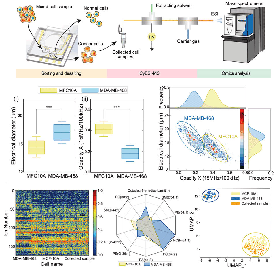 该系统进一步用于正常乳腺上皮细胞MCF-10A和癌变的乳腺癌细胞MDA-MB-468的分选与检测。通过双频点的锁相检测,分别表征了两类细胞的电学特性,并据此进行了分选操作,结果表明MCF-10A细胞的纯度由 10.64% 提升至77.78%,展现出了约7.31 倍的富集效率。此外将收集到的细胞样本直接与免标记质谱流式装置级联实验,同时表征了两类细胞的代谢特征,结果表明,部分显著差异表达的代谢和脂质可能是致使细胞电学特性差异的原因,充分验证了系统在多模表征与临床分析中的应用价值。