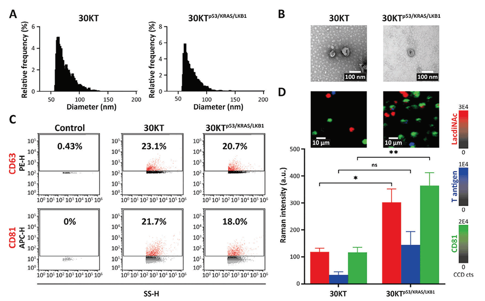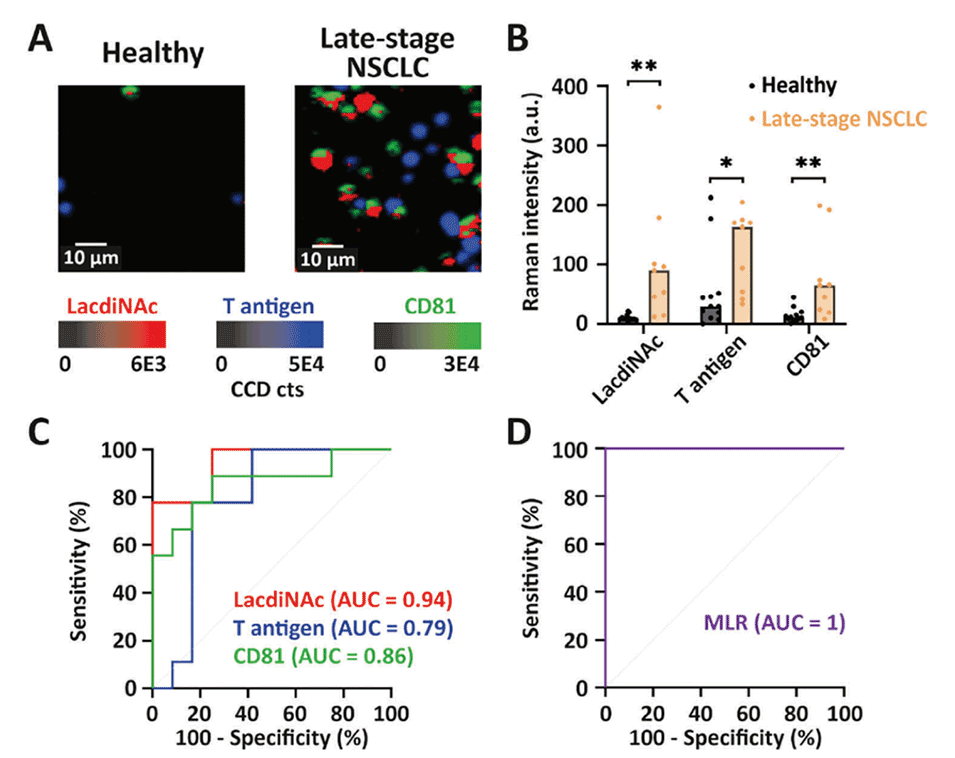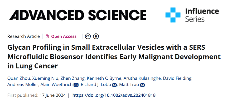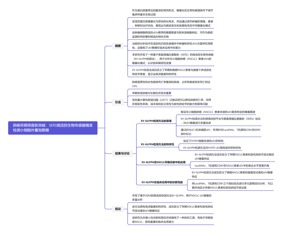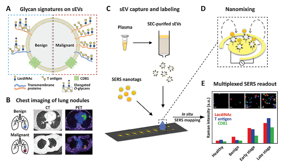 近日,有研究人员开发了一种sEV聚糖表型(EV-GLYPH)检测方法,利用微流控平台和表面增强拉曼散射技术对非小细胞肺癌中的sEV聚糖进行多重分析。相关研究以“Glycan Profiling in Small Extracellular Vesicles with a SERS Microfluidic Biosensor Identifies Early Malignant Development in Lung Cancer”为题目,发表在期刊《Advanced Science》上。