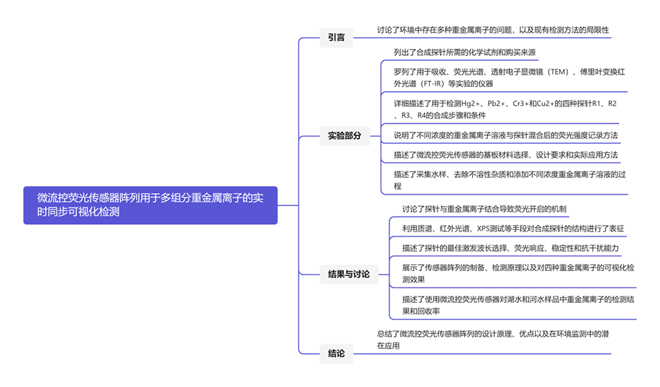1、本研究通过结合微流控传感技术和有机荧光开关设计了一种微流控荧光传感器阵列,用于实时、同步检测环境中的多组分重金属离子。