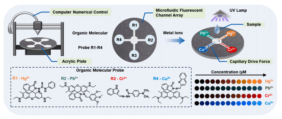 环境重金属离子大多以多组分形式存在,目前单对单的快速检测方法无法满足多组分同时检测的需求。近期,中国科学院合肥物质科学研究院固体物理研究所蒋长龙研究员团队设计了一种微流控荧光传感器阵列,将微流控传感与有机荧光开关相结合,实现了多组分重金属离子的实时、同步可视化检测。相关研究以“Design of microfluidic fluorescent sensor arrays for real-time and synchronously visualized detection of multi-component heavy metal ions”为题目,发表在期刊《Chemical Engineering Journal》上。