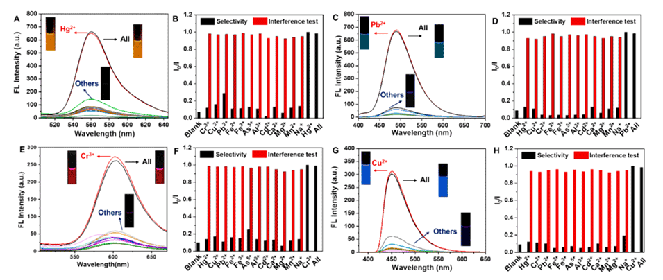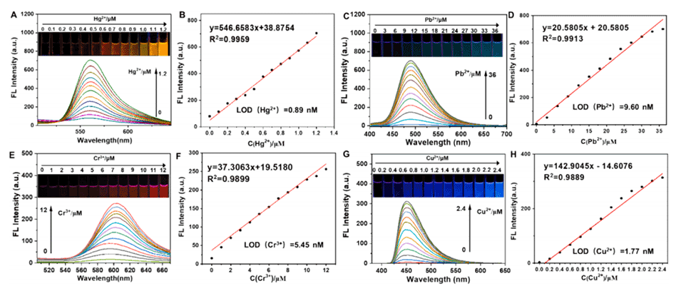 图2.暴露于(A)Hg2+、(C)Pb2+、(E)Cr3+、(G)Cu2+的探针溶液的荧光光谱。插图显示了在365nm紫外线照射下的相应荧光照片。(B)荧光强度与Hg2+浓度之间的线性关系。(D)荧光强度与Pb2+浓度之间的线性关系。(F)荧光强度与Cr3+浓度之间的线性关系。(H)荧光强度与Cu2+浓度之间的线性关系。