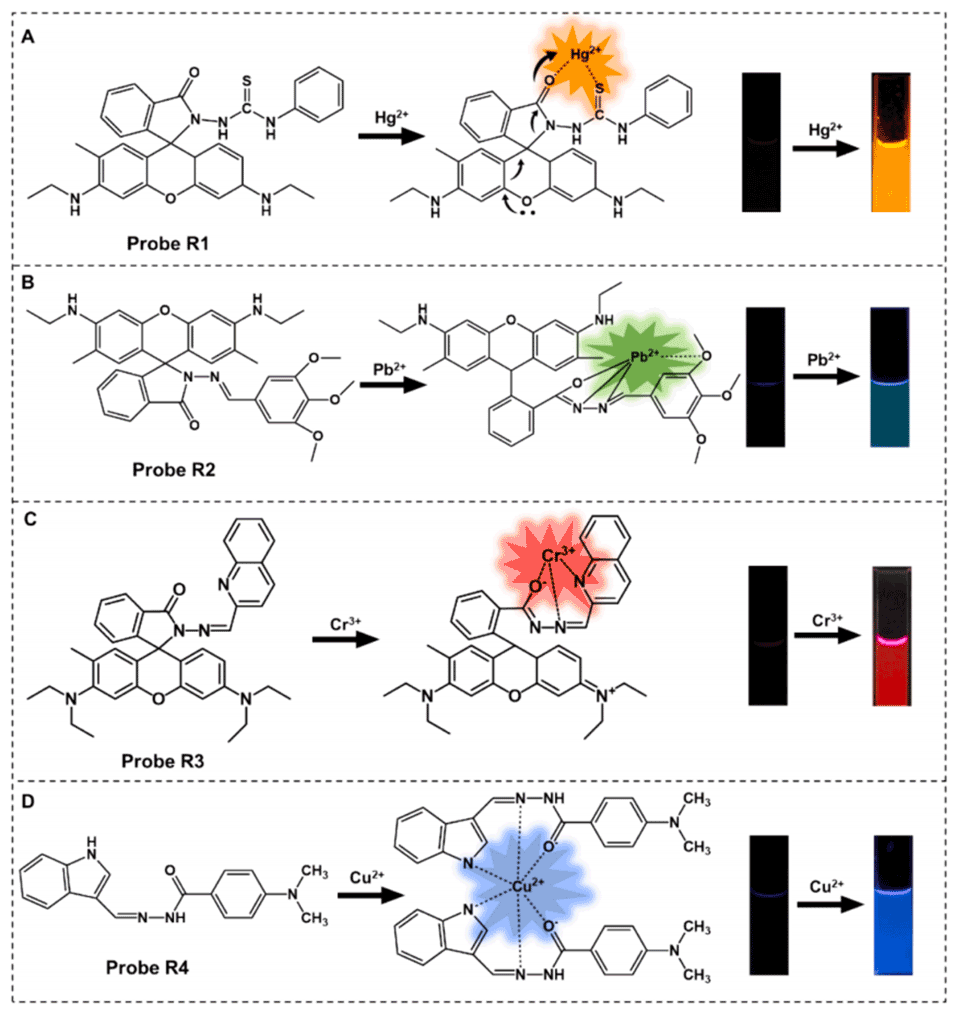 2、设计并合成了一系列“发光”有机分子探针,这些探针具有与重金属离子结合并开启荧光的能力。