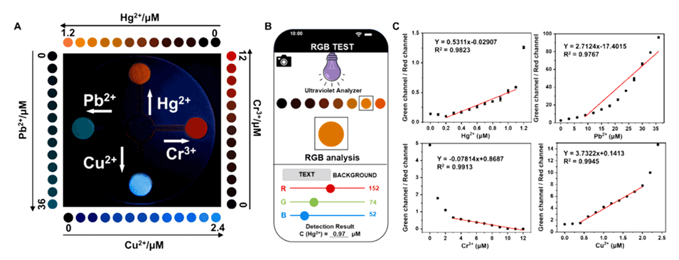 图5.(A)微流控荧光传感器阵列用于测量四种重金属离子及其各自的颜色变化。(B)手机传感器平台的界面显示。(C)G/R值之间的线性关系。
