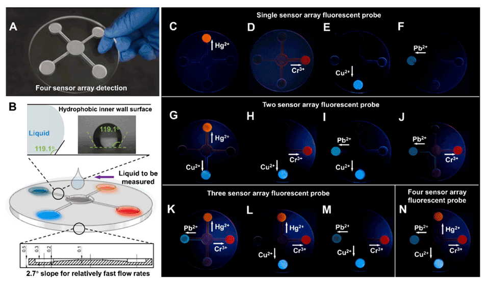 图4.(A)四个传感器阵列检测。(B)荧光微流控传感器阵列的结构和疏水内壁。(C)-(F)单传感器阵列纳米有机分子荧光探针。(G)-(J)两个传感器阵列纳米有机分子荧光探针。(K)-(M)三个传感器阵列纳米有机分子荧光探针。(N)四传感器阵列纳米有机分子荧光探针。