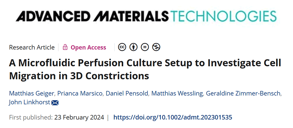 近期,有研究者开发了一种微流体灌注培养系统,用于精确控制和观察细胞在三维狭窄空间中的迁移行为及其对细胞核变形和转录组变化的影响,为理解细胞在复杂几何狭窄空间中的迁移机制提供了新的实验方法。相关研究以“A Microfluidic Perfusion Culture Setup to Investigate Cell Migration in 3D Constrictions”为题目发表在期刊《Advanced Materials Technologies》上。