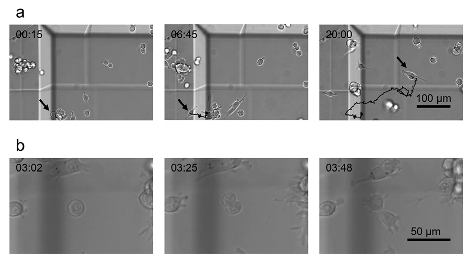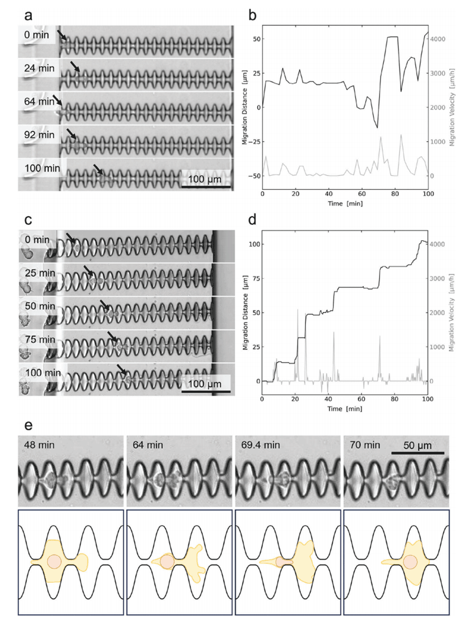 图4.细胞在100分钟内通过半径为a)4和c)2μm的收缩通道的迁移情况。细胞的位置由黑色箭头指示。100分钟内通过半径为b)4和d)2μm的收缩通道的迁移距离(黑色,左轴)和迁移速度(灰色,右轴)。对于狭窄的通道,观察到细胞先是停滞然后迅速通过;而对于较宽的通道,细胞则无阻碍地通过并重新极化。e)显微镜图像和示意图展示了细胞通过一个半径为2μm的狭窄通道的过程。