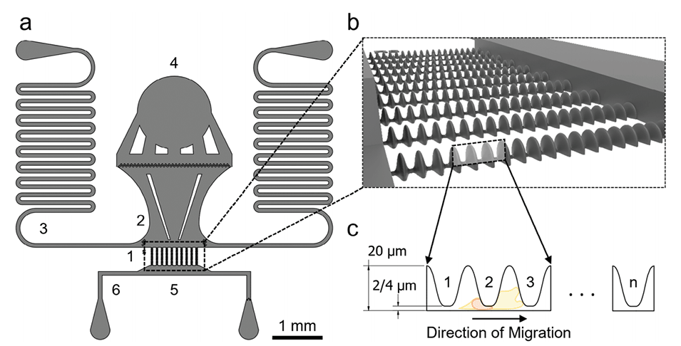 细胞迁移是器官形态成熟、癌症等疾病相关状况的一个基本过程。细胞能够穿过拥挤的空间和紧密的细胞外基质(ECM)进行迁移。通过狭窄区域时,细胞会发生强烈变形,包括细胞核。这种核变形会导致3D基因组结构的变化,并可能导致DNA甲基化。然而,变形对细胞的具体影响尚不完全清晰。因此,迫切需要建立一种离体方法,在复杂几何狭窄区域诱导明确的细胞变形。