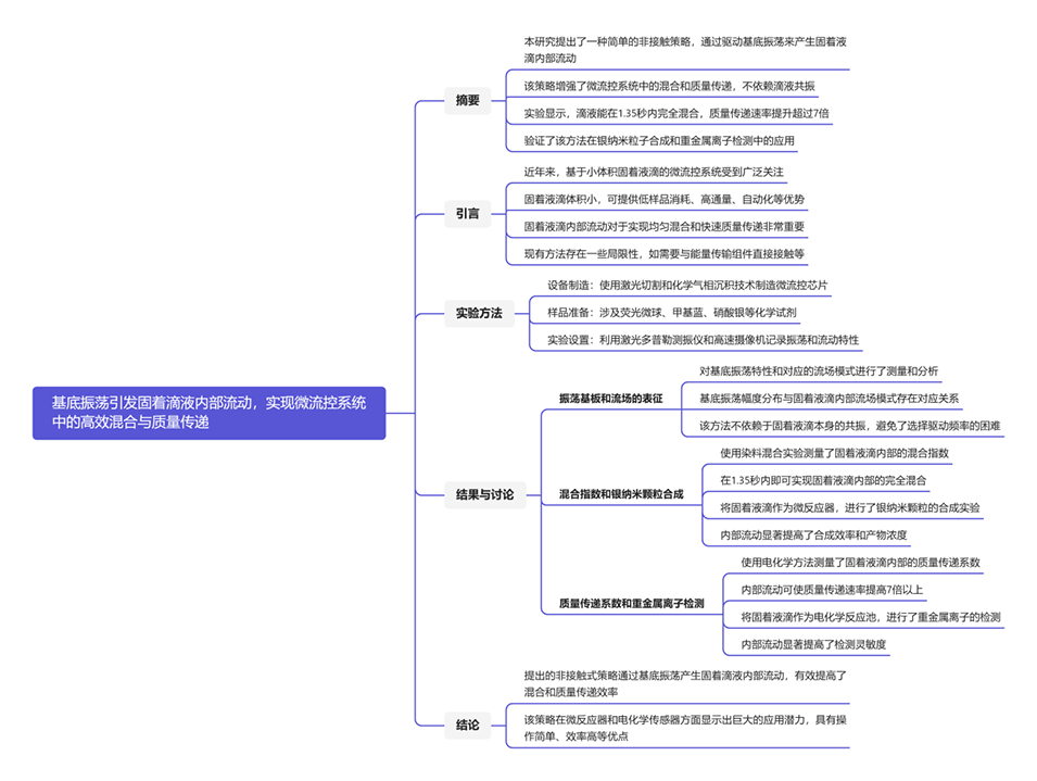 1、本文提出了一种简单的非接触式策略,通过基底振荡引发固着液滴内部流动,以增强微流控系统中的混合和质量传递。