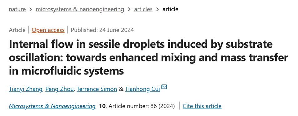 近期,明尼苏达大学崔天宏教授团队提出了一种通过基底振荡诱导固着滴液内部流动的新策略,以增强微流控系统中的混合和质量传递,并通过实验验证了其在合成银纳米粒子和重金属离子检测方面的应用效果。相关研究以“Internal flow in sessile droplets induced by substrate oscillation: towards enhanced mixing and mass transfer in microfluidic systems”为题目发表于期刊《Microsystems & Nanoengineering》。