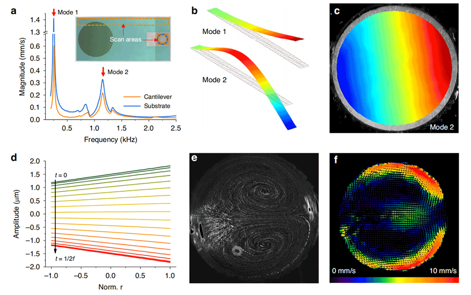 图2.传动组件的共振特性和固着液滴的内部流动特性。