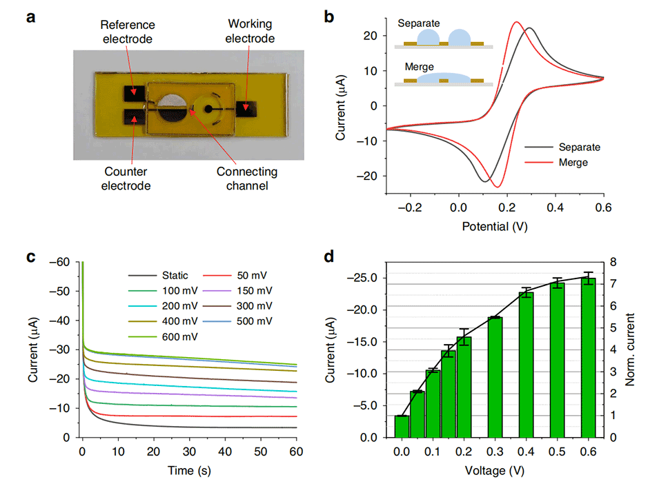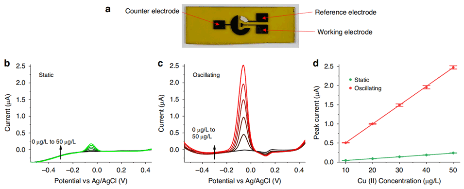 图6.使用固着液滴样品对重金属离子进行电化学检测。