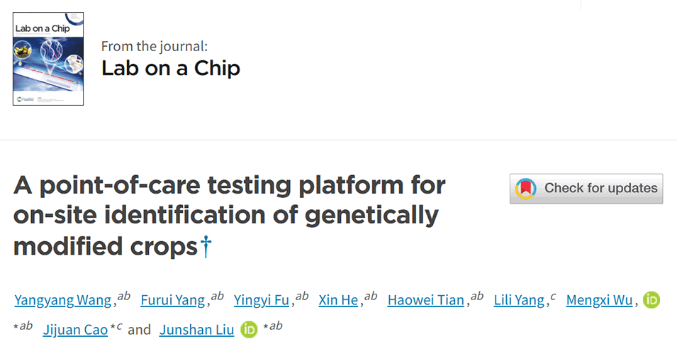 为了满足现场检测的迫切需求,近期,大连理工大学吴梦希教授、刘军山研究员等人开发了一种基于微流控技术的即时检测平台,可在不到40分钟内识别12种转基因作物,无需实验室环境。相关研究以“A point-of-care testing platform for on-site identification of genetically modified crops”为题目,发表在期刊《Lab on a Chip》上。