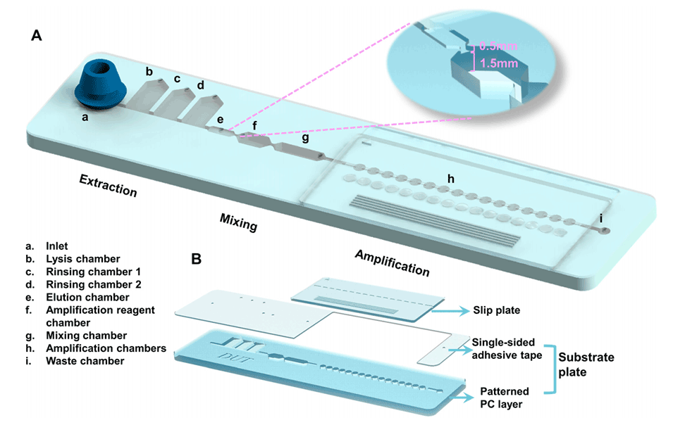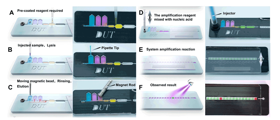 2、该系统将样品预处理模块集成到微流控芯片中,利用电池供电的便携式试剂盒进行DNA扩增,并通过肉眼识别的比色变化呈现结果。