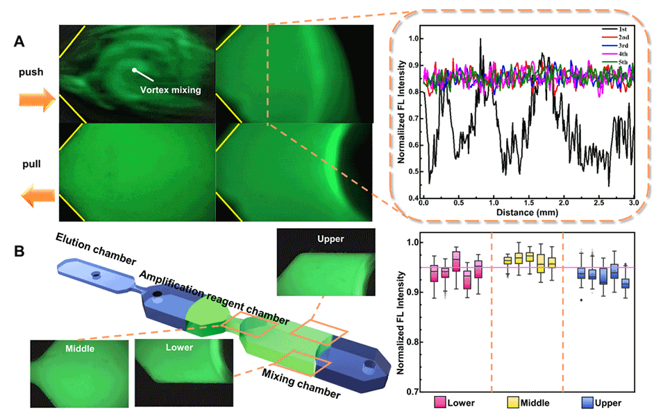 图4.推拉驱动的试剂混合性能验证。