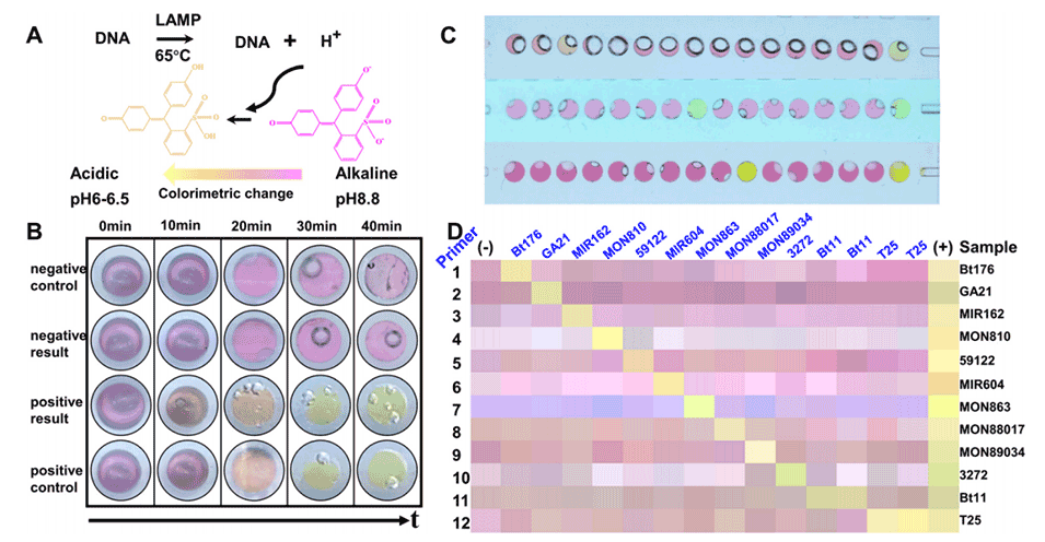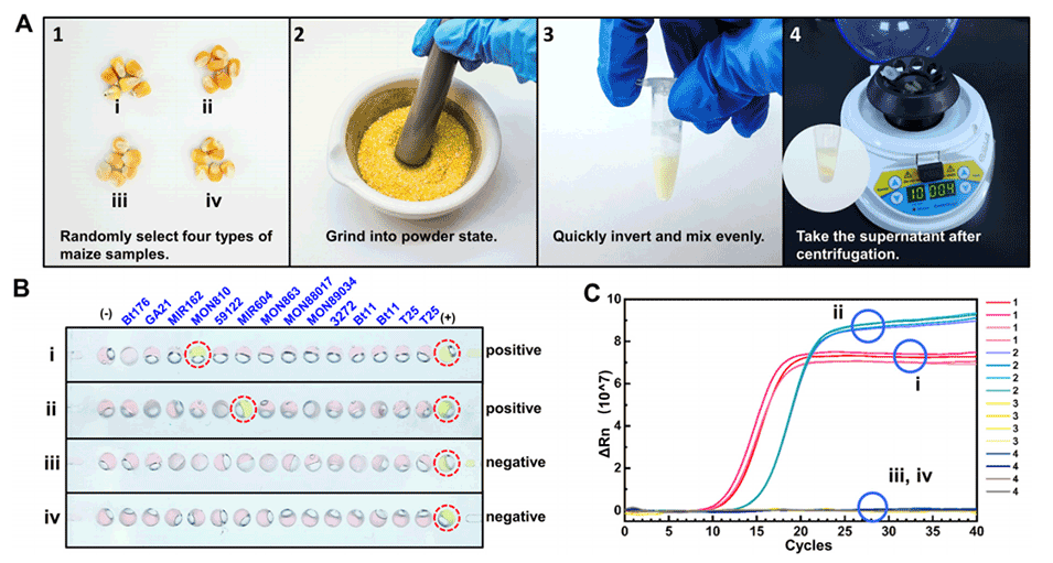 近年来,转基因技术的产业化发展迅速。全球有29个国家批准商业种植转基因(GM)作物,种植面积总计超过1900万平方公里。然而,公众对GM产品安全性的担忧不断增加,一些国家仍然反对GM作物,因此GM作物的识别变得至关重要。目前,主要的GM作物识别方法包括基于蛋白质和基于核酸的检测方法。基于核酸的方法具有灵敏度高、特异性强、适用性好等特点,被广泛认为是实验室的标准方案。然而,核酸提取、DNA片段扩增和外源基因修饰的检测需要一系列专业的仪器设备和训练有素的人员。鉴于农作物数量庞大以及海关、市场等环境的复杂性,实现现场检测和缩短检测周期变得极为重要。