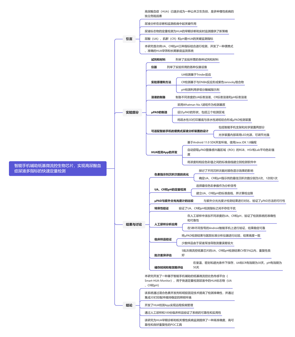 1、本研究提出了一种基于智能手机辅助纸基微流控生物芯片的用户友好型即时检测系统(称为“Smart-HUA-Monitor”),用于比色定量测定HUA尿液标志物,包括尿酸(UA)、肌酐(CR)和pH值。