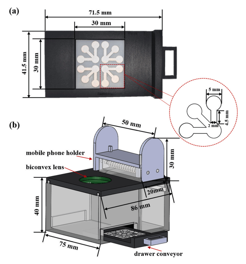 图1.(a)用于检测HUA生物标记物的微流控纸基装置的设计。(b)基于智能手机的HUA检测系统的光学附件构造示意图。