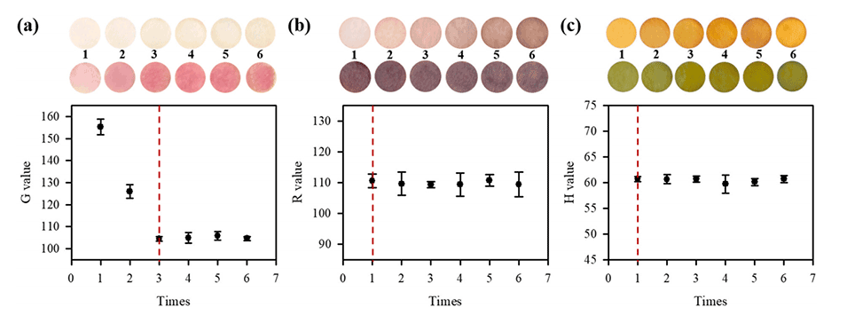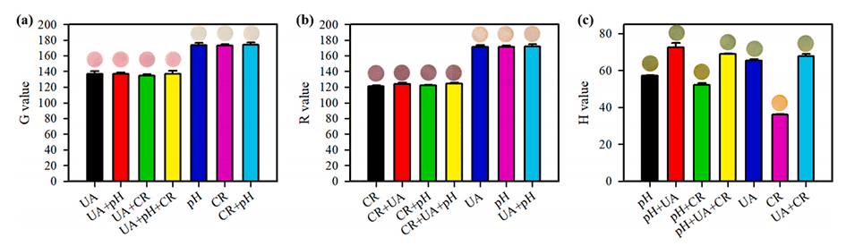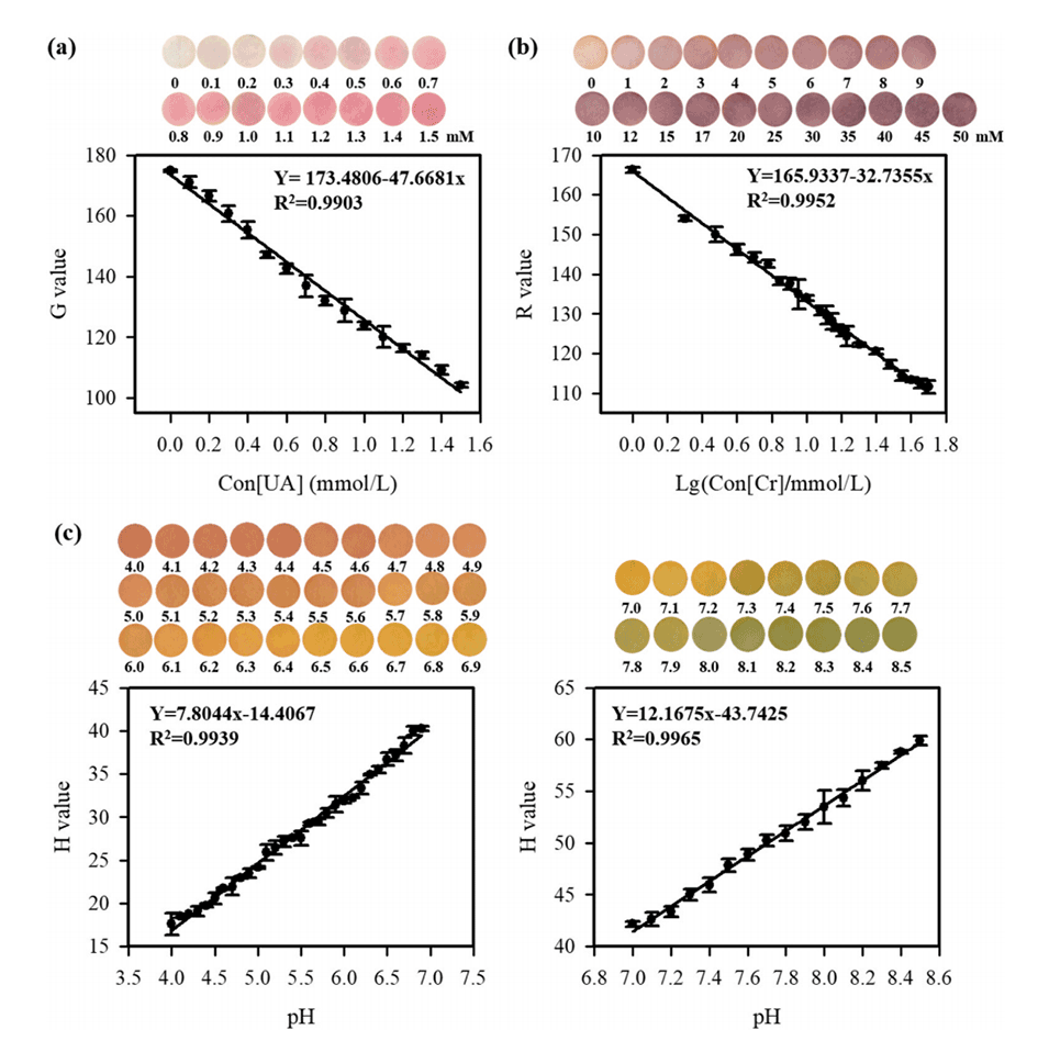 图3.(a)UA、(b)CR、(c)pH三种指标的定量检测标准曲线及显色图像。