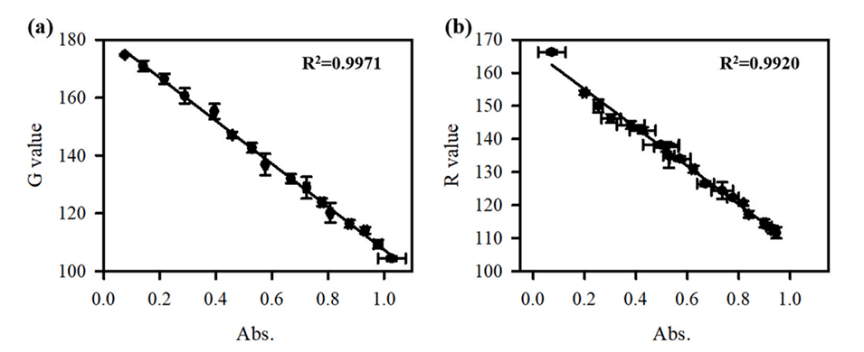 图4.(a)UA,(b)CR,标准纸基微流控比色法和吸光度结果对比。