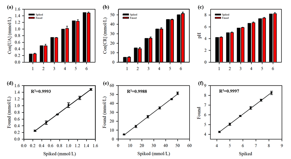 图6.(a)-(c)纸基微流控装置检测人工尿液的UA、CR和pH结果比较。(d)-(f)分别为UA、CR和pH检测结果的一致性分析。