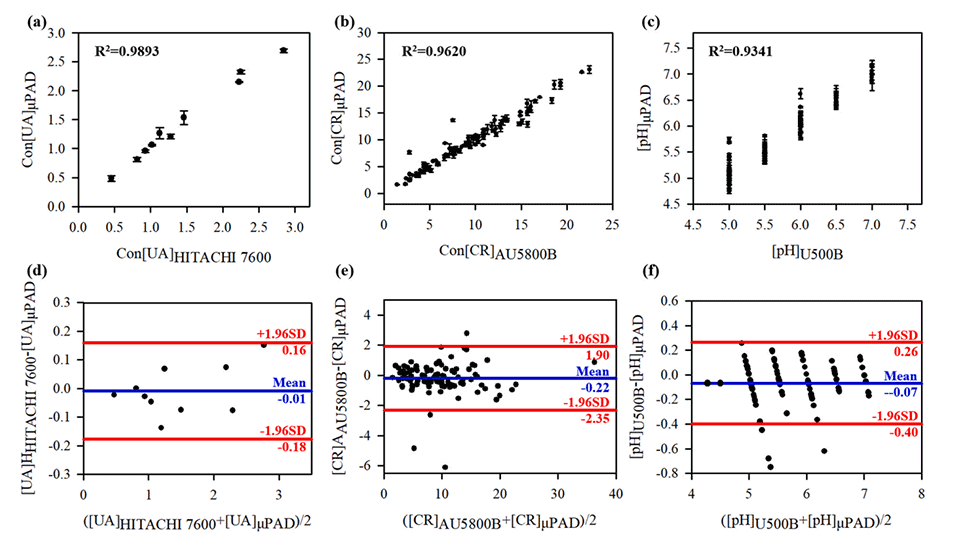 图7.(a)-(c)纸基微流控装置与标准生化分析仪对真实尿样的UA、CR和pH检测结果的对比分析。(d)-(f)分别为UA、CR和pH检测结果的一致性分析。