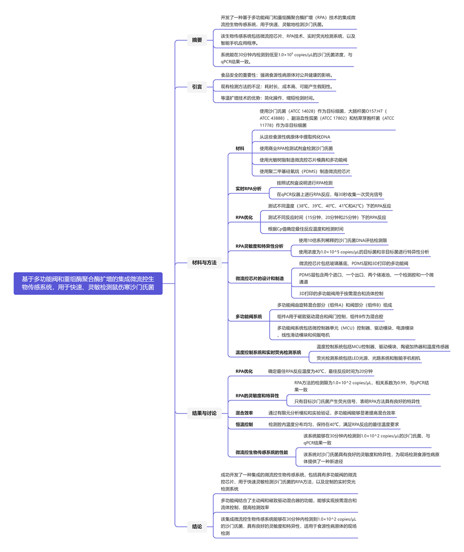 1、本文介绍了一种用于快速灵敏检测鼠伤寒沙门氏菌的集成微流控生物传感系统。