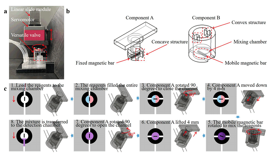 图3.(a)多功能阀门系统的图像。(b)多功能阀门设计方案。(c)多功能阀门工作过程示意图。