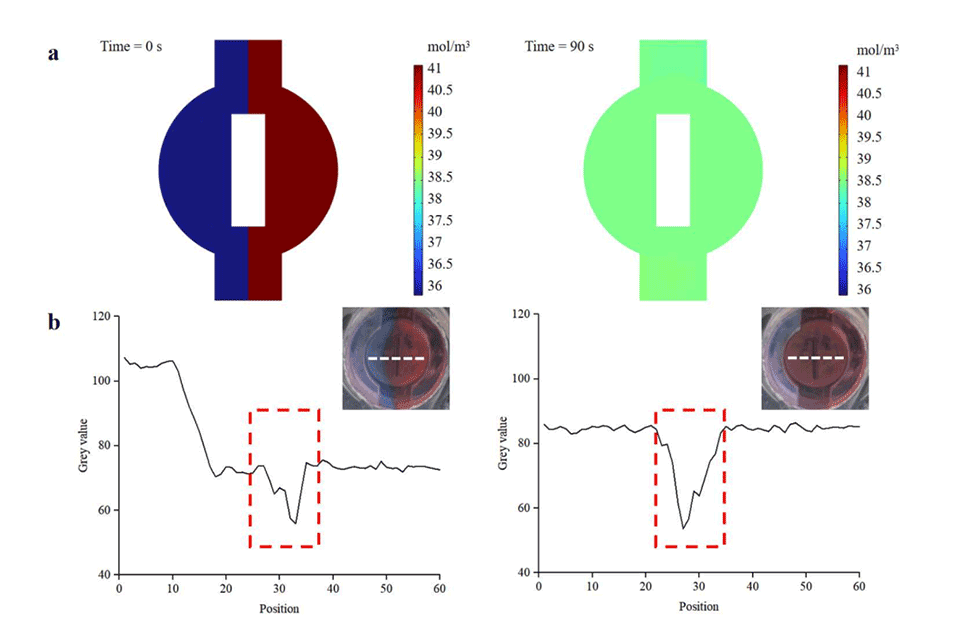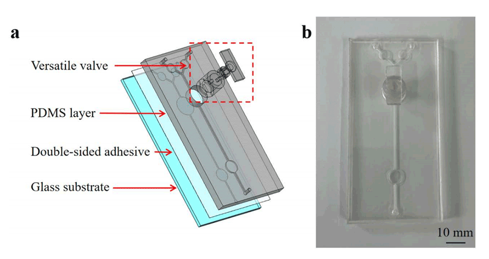 图2.芯片透视图(a)和微流控芯片的图像(b)。