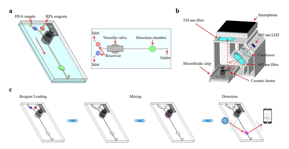2、该生物传感系统由具有多功能阀的微流控芯片、用于核酸检测的重组酶聚合酶扩增(RPA)和定制的实时荧光检测系统组成。