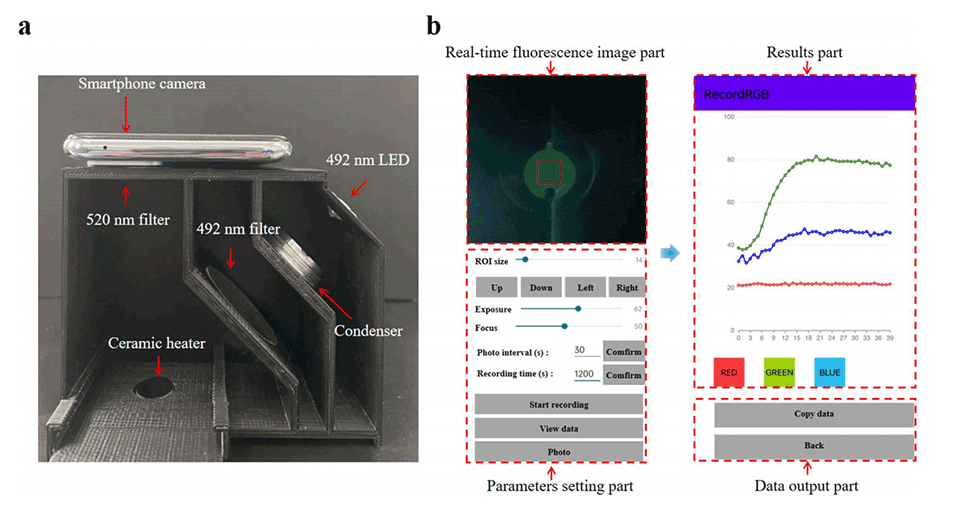 图4.(a)实时荧光检测系统的图像。(b)定制的Android应用程序的操作界面和结果页面的截屏图像。
