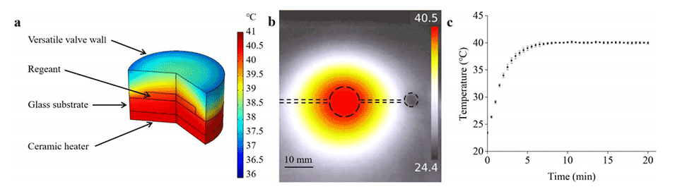 图8.(a)温度-恒定状态的COMSOL仿真结果。(b)微流控芯片的热红外图像。(c)检测室中试剂的温度变化。