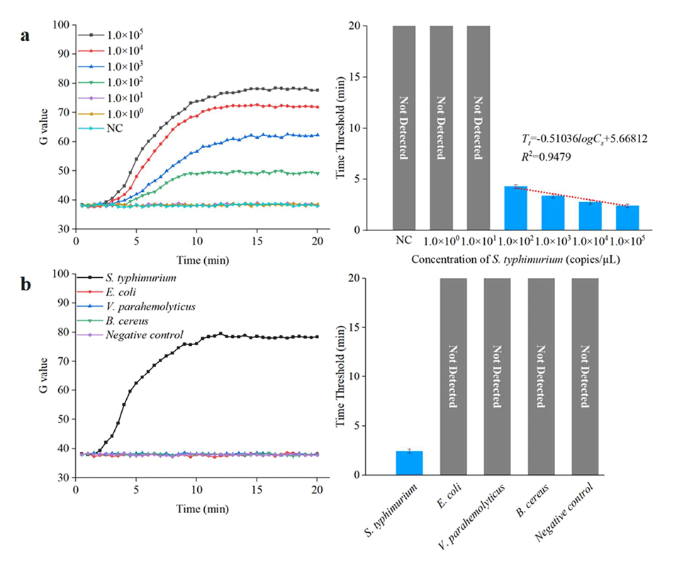 5、提出的集成微流控生物传感系统可以在30分钟内检测到浓度低至1.0×102copies/µL的沙门氏菌,这与实时定量聚合酶链式反应(qPCR)测试的结果一致。